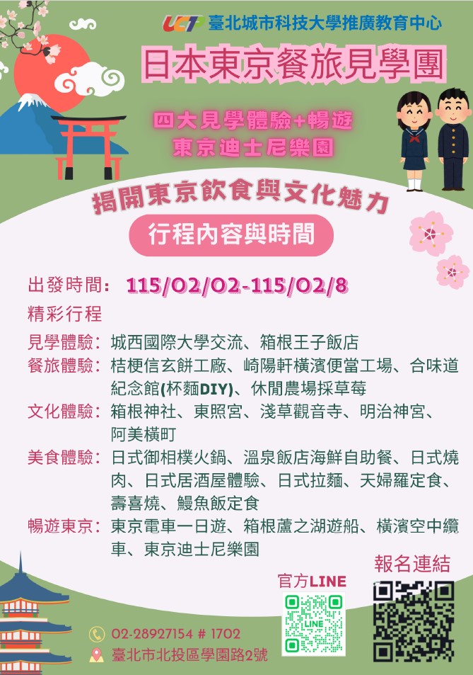 一、日本東京為國際化大都市,擁有豐富的歷史文化,也以其 世界級的餐飲業和酒店業聞名全球。本校規劃此次東京餐 旅見學團將帶領同學深入探索日本餐飲與旅遊產業的精 髓,親身體驗日本傳統飲食文化與現代餐旅服務業的完美 結合,啟發學生對餐飲和酒店管理領域的熱情與專業理 解。