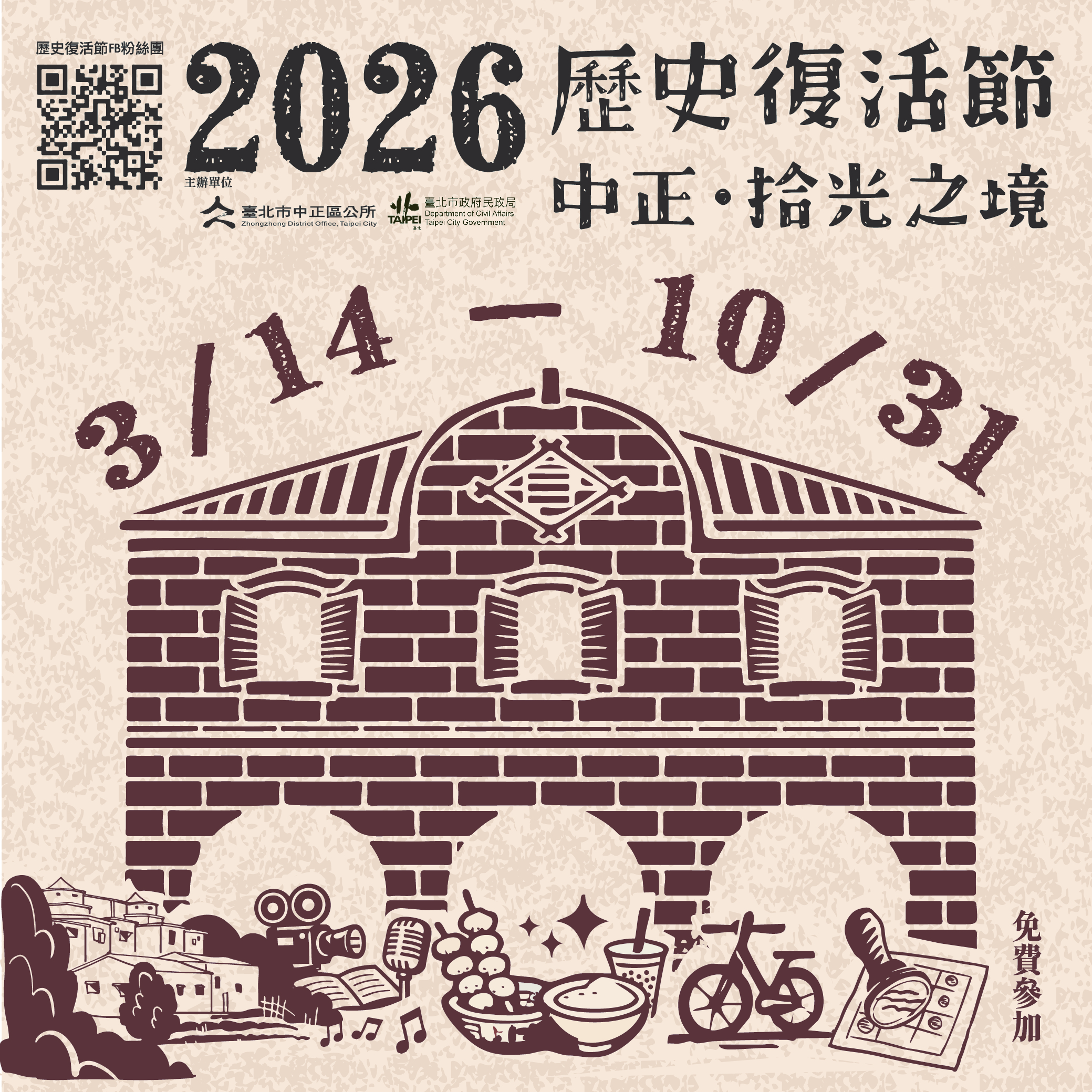 「2026歷史復活節~中正.拾光之境」系列藝文 活動,於115年3月14日至10月31日登場!豐富精采的系 列活動,邀您一起在中正拾起美好時光,品味獨特的中 正區地方文化!詳情請上臺北市中正區公所網站基層藝 文專區(https://reurl.cc/xpmNqe)或歷史復活節FB粉 絲團(https://www.facebook.com/papagozhongzheng)查 詢,活動簡介如下: