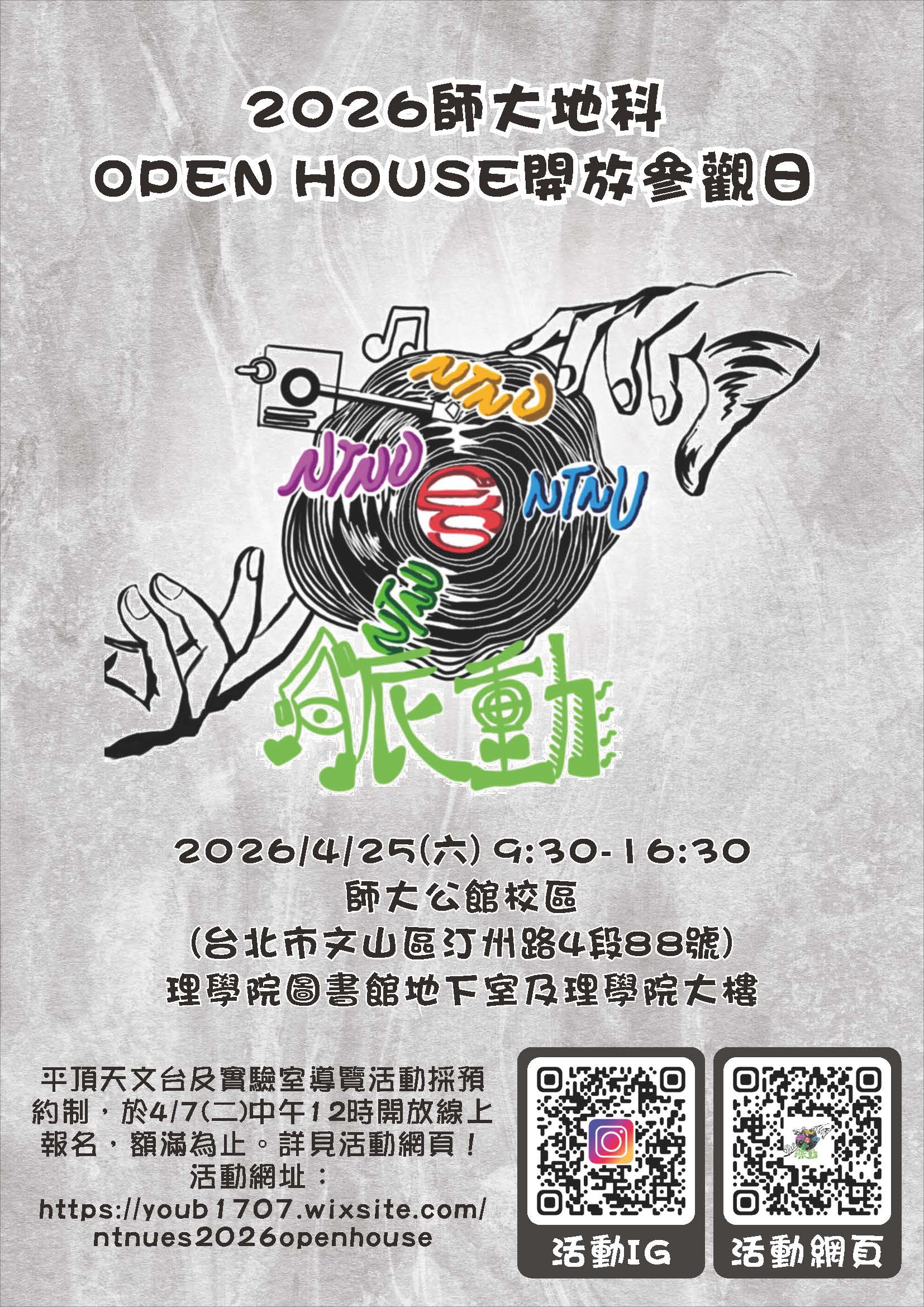 一、為推廣地球科學教育並引發學生對自然科學之學習興趣, 地球科學系特辦理「2026師大地科開放參觀日」,結 合互動體驗、實境解謎與研究展示,提供一場兼具知識性 與趣味性的學習活動。