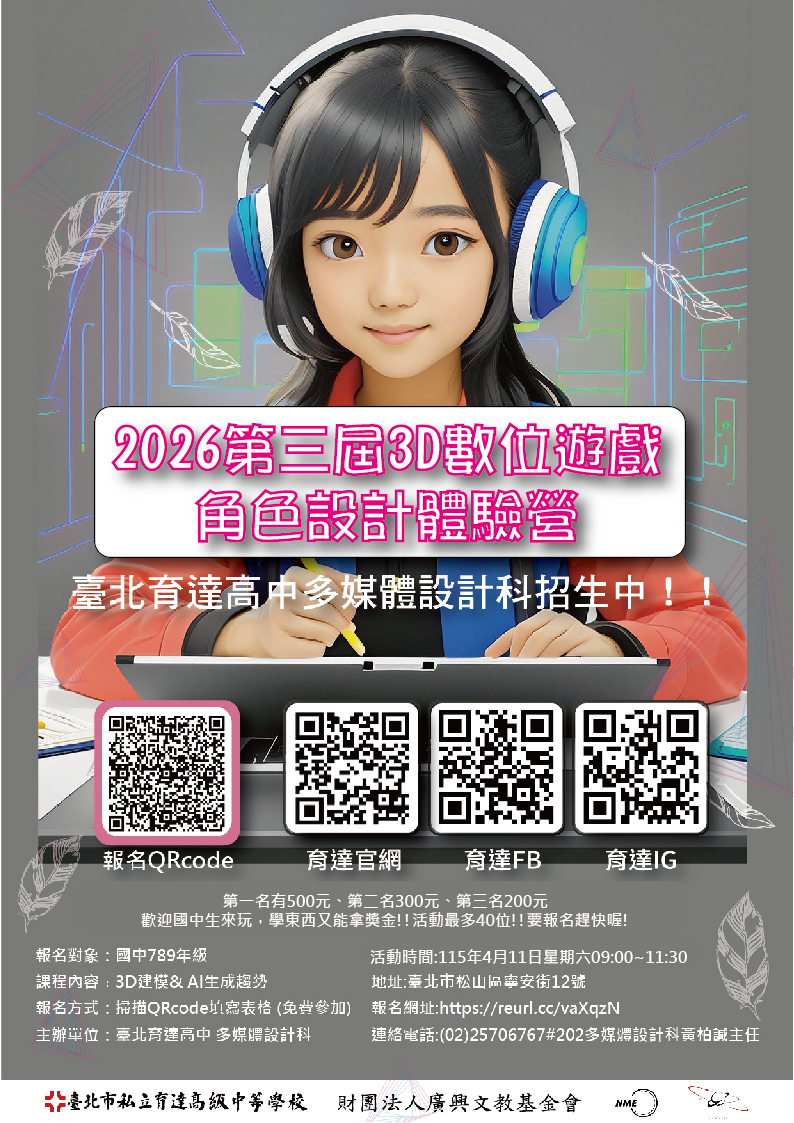 一、育達高中以掌握趨勢,培育達人作為宗旨,希望能夠讓更 多學生及早學習職場技能,在業界成為佼佼者。「3D數位 遊戲藝術」為勞動部全國技能競賽職種,本校5年來協助培 訓3D職種榮獲多項佳績,本次活動找來3D動畫師,歡迎國 中生來體驗!!