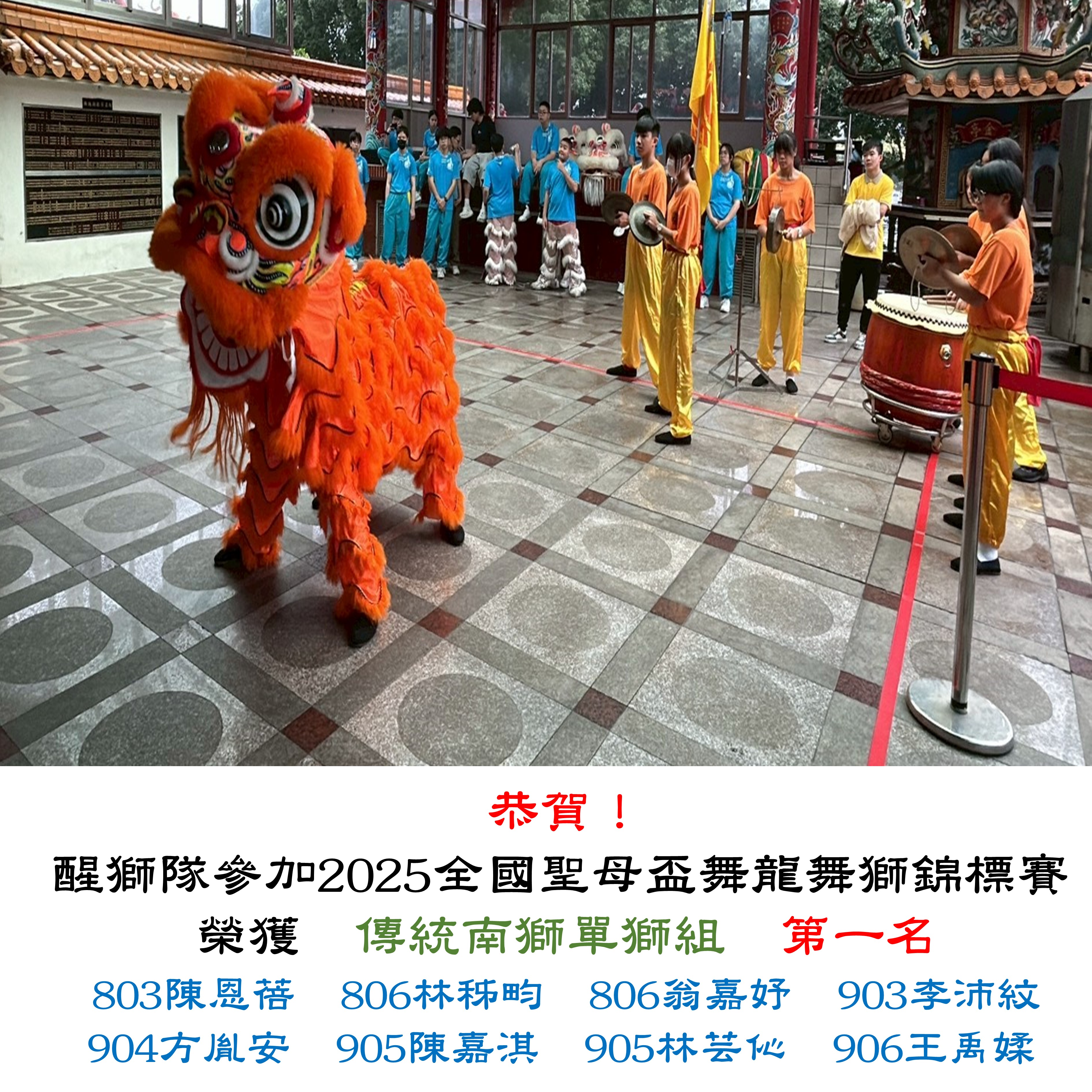 恭賀!醒獅隊參加2025全國聖母盃舞龍舞獅錦標賽榮獲 傳統南獅單獅組 第一名803陳恩蓓 806林秭畇 806翁嘉妤 903李沛紋904方胤安 905陳嘉淇 905林芸伈 906王禹媃