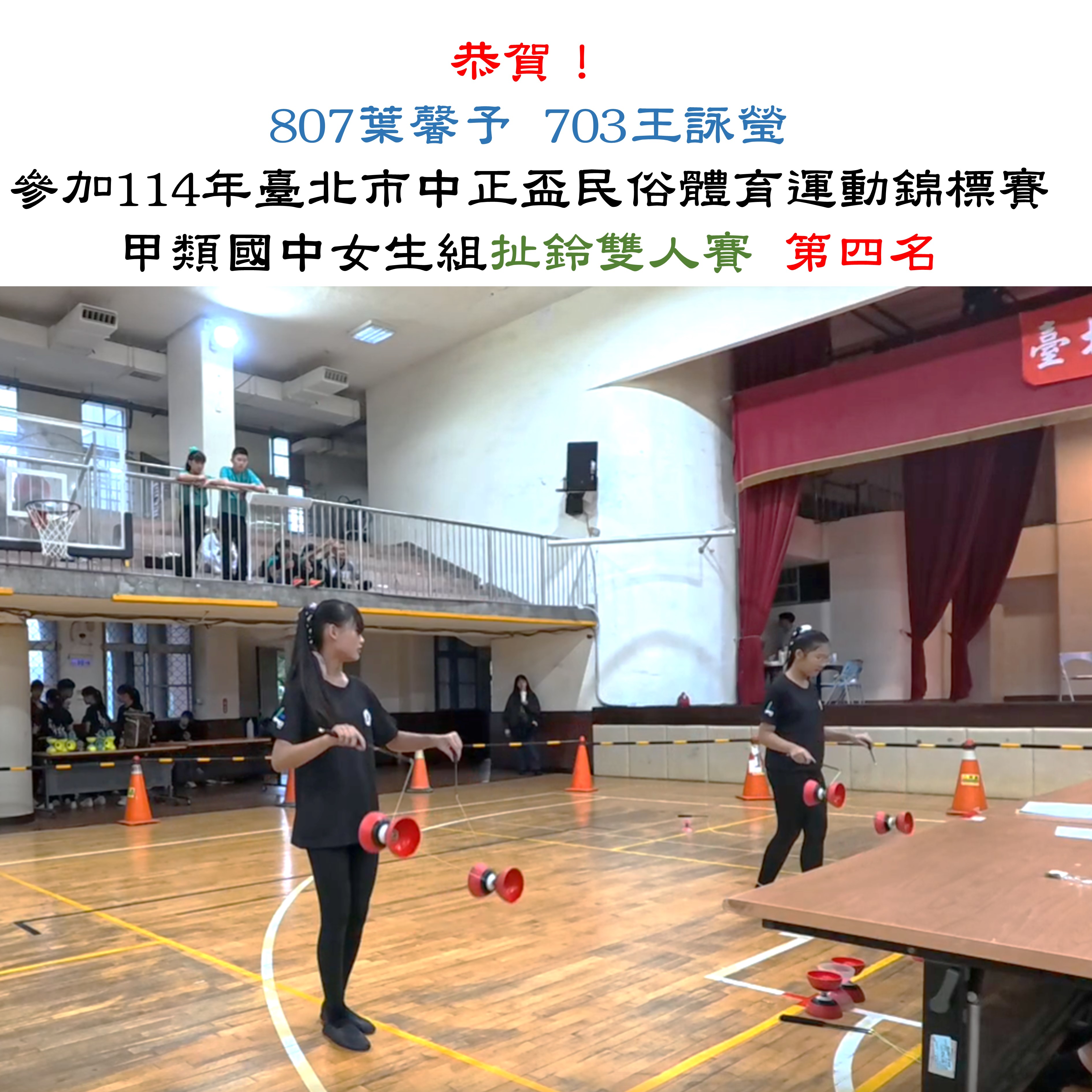 恭賀!807葉馨予 703 王詠瑩參加114年臺北市中正盃民俗體育運動錦標賽甲類國中女生組扯鈴雙人賽 第四名