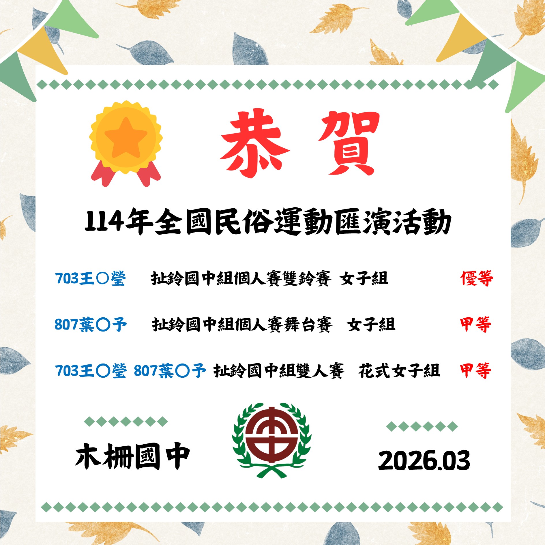 恭賀!703王〇瑩、807葉〇予