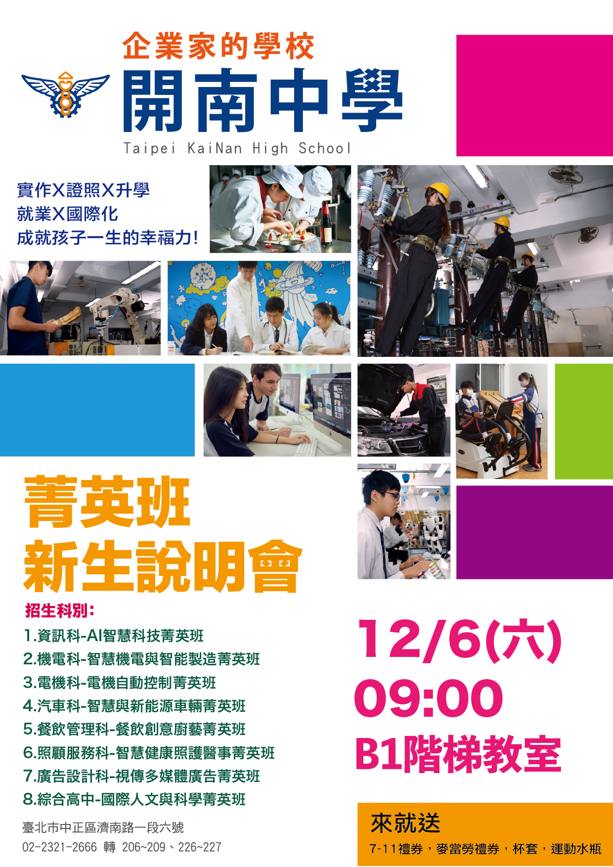一、為符應社會需求及厚植學生未來競爭力,本校全面朝「升 學菁英」及「技能菁英」培養,目前設「餐飲管理科(餐飲 創意廚藝菁英班)、廣告設計科(視傳多媒體廣告菁英班)、 機電科(智慧機電與智能製造菁英班)、汽車科(智慧與新能 源車輛菁英班)、電機科(電機自動控制菁英班)、資訊科 (AI智慧科技菁英班)、照顧服務科(智慧健康照護醫事菁英 班)、綜合高中(國際人文與科學菁英班)」等科,提供家長 及學生選擇。